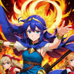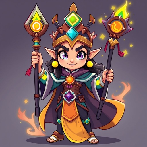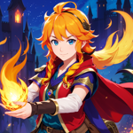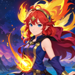 a woman in a red and gold outfit holding a flame