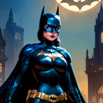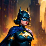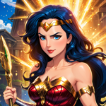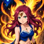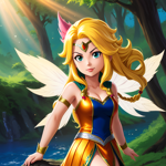 a girl in a blue shirt and red bow tie standing in front of a forest