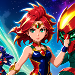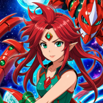 a girl with red hair and green eyes standing in front of a red dragon