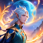 a man with white hair and blue eyes in front of a full moon