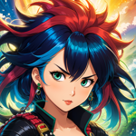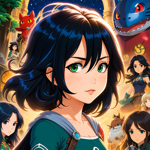 an anime character with blue hair and other characters around her
