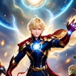 a blonde haired woman in a blue and red outfit