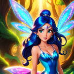 a girl in a blue dress with a fairy wings on her head