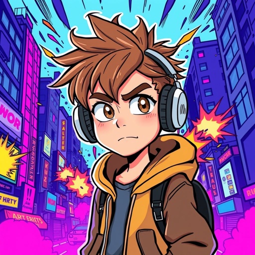 Make a very cool boy with brown hair looking bored with a hood on and headphones on and the background as a exploding ci...