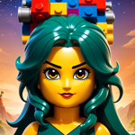 a woman with green hair wearing a lego hat