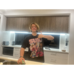a man in a blue shirt with a golden chain around his neck