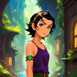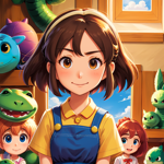 a girl with blue eyes standing in front of a group of cartoon characters