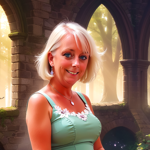 a woman in a blue tank top standing in front of a castle
