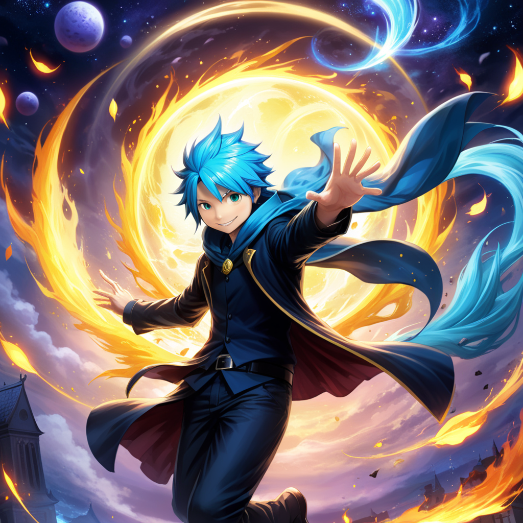 a man with blue hair and blue eyes is flying through the air