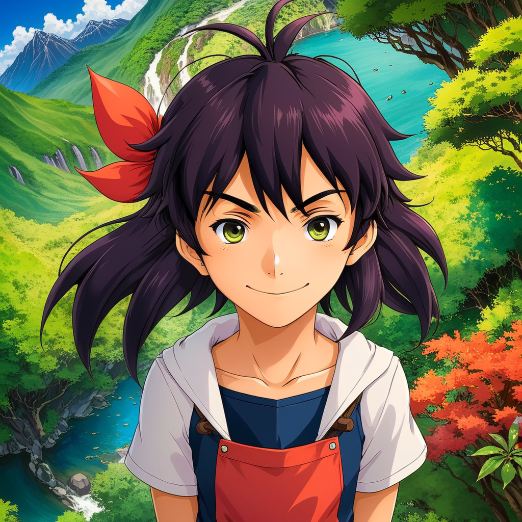 a boy standing in front of a waterfall with a castle in the background