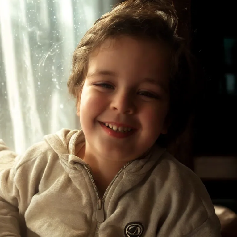 a young boy smiles while sitting in front of a window