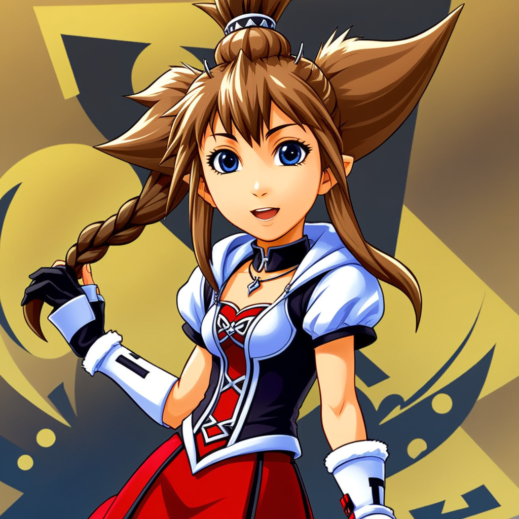 a woman in a red and white dress with a ponytail