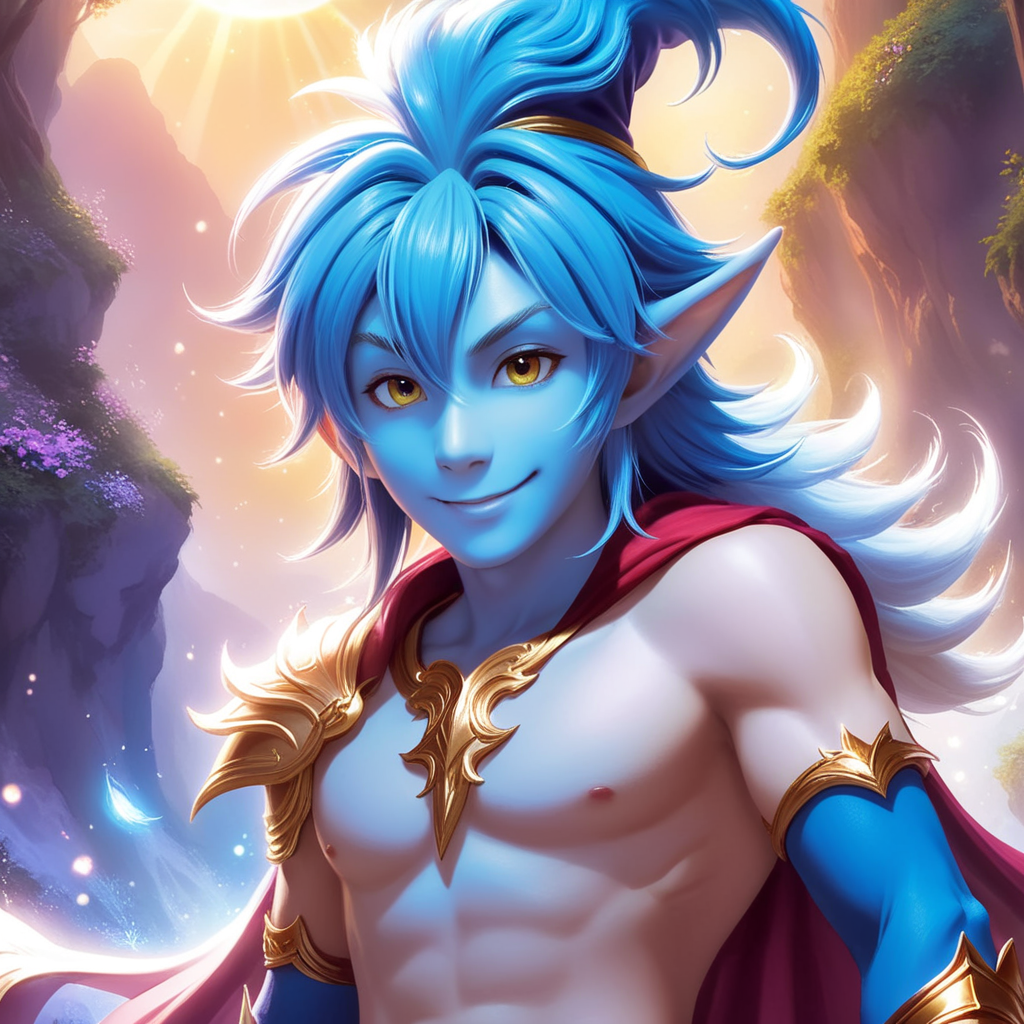 a man with blue hair wearing a blue cape