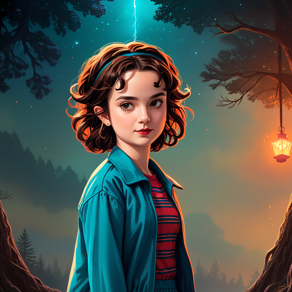 a painting of a girl standing in a forest