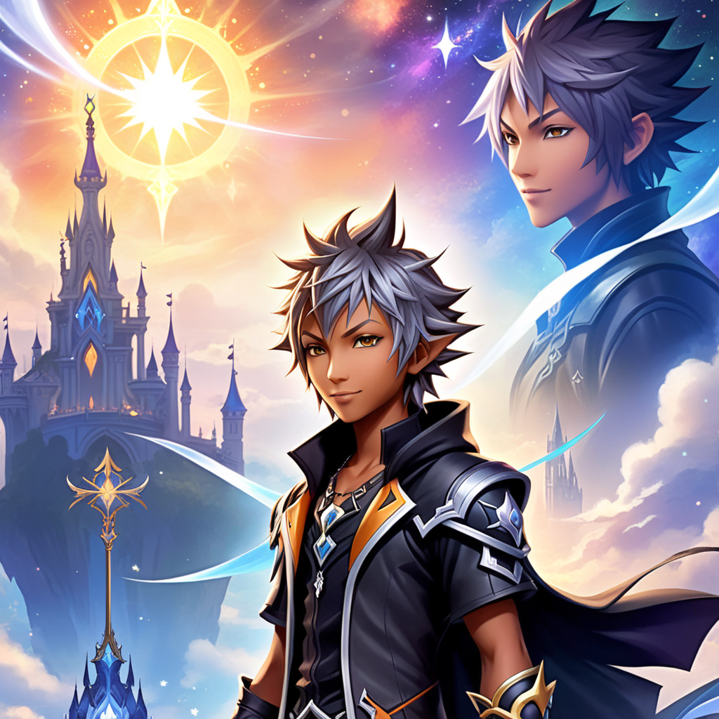 a boy standing in front of a waterfall with a castle in the background