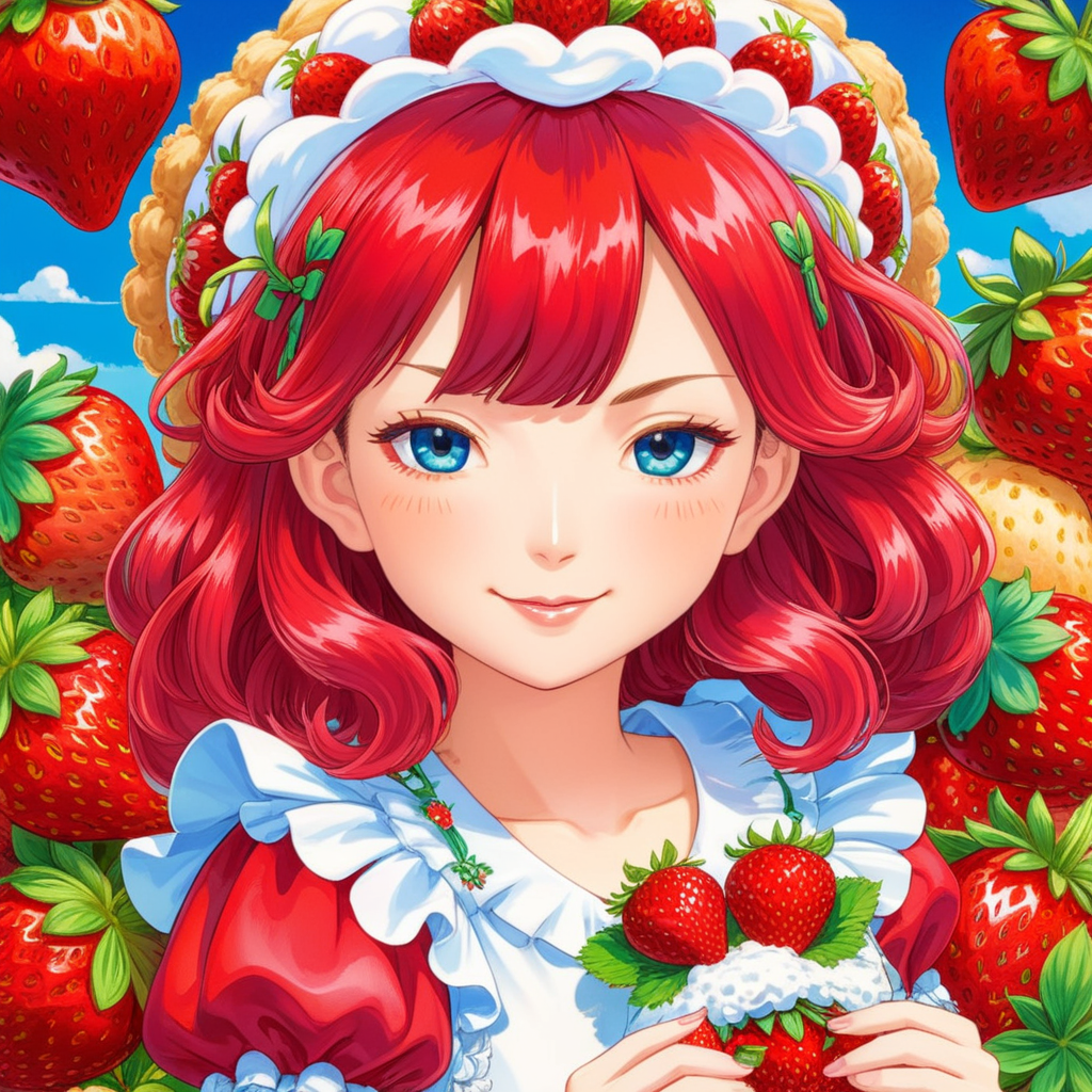 a girl with red hair holding a strawberry