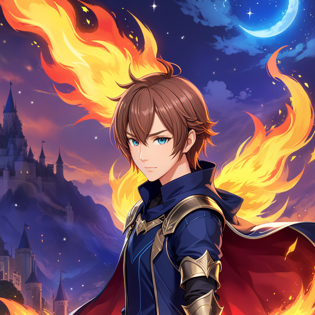 a girl with red hair and blue eyes standing in front of a castle