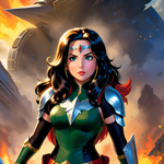 a woman with blue eyes and a red cape