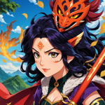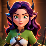 a woman with a sword standing in front of a demon