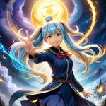 an anime character with blue hair and other characters around her