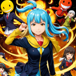 a group of anime characters with guns and a smiley face