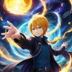 a man in a black coat and yellow hair holding a sword