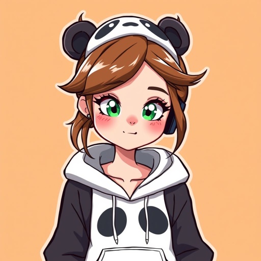 Female Gamer with a panda hoodie - brown hair in a messy bun with green eyes and slight freckles