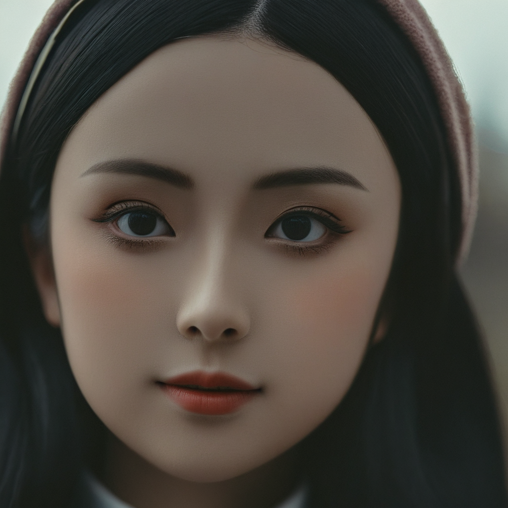 a close up of a doll's face with long black hair