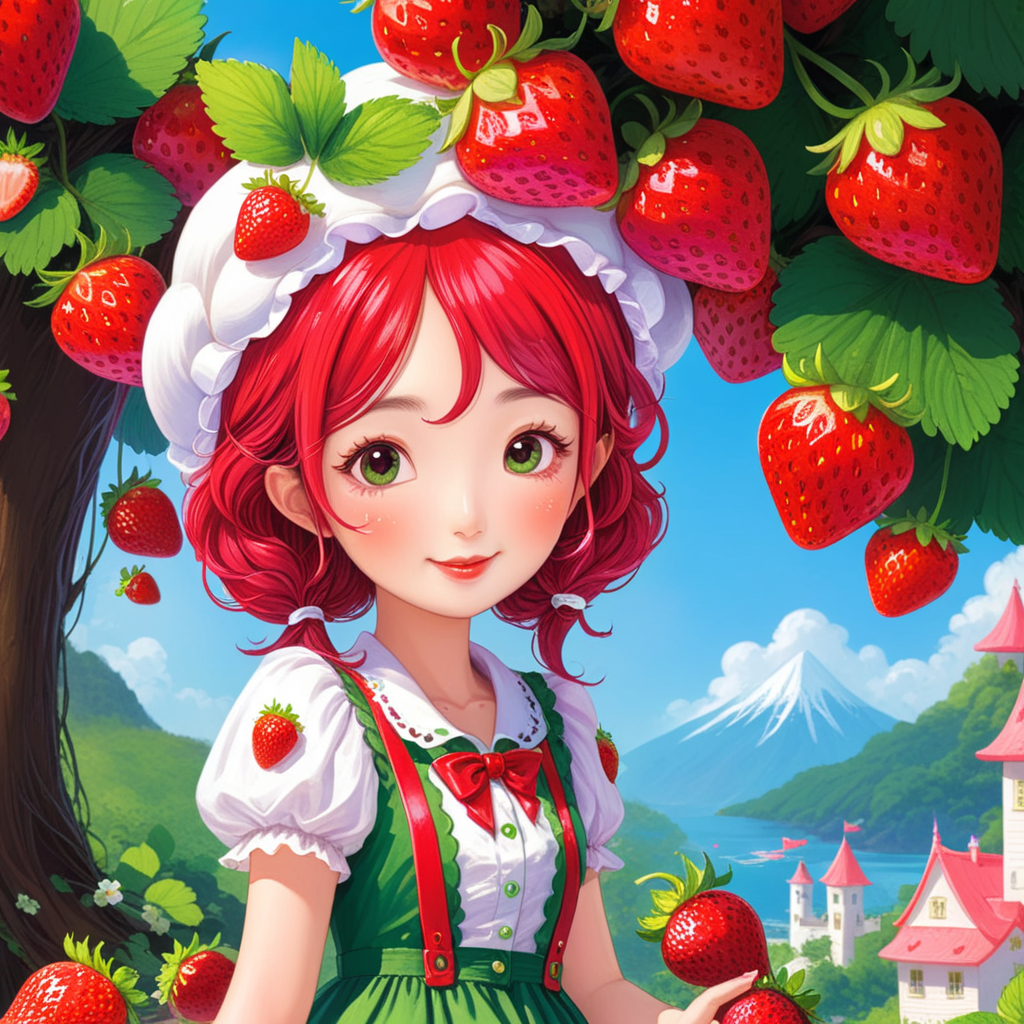 a painting of a little girl holding strawberries