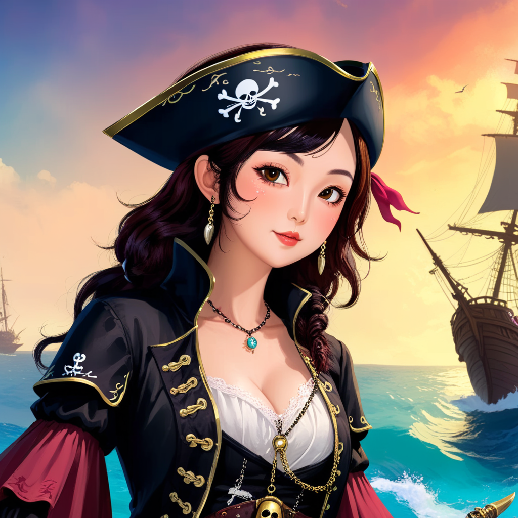 a woman in a pirate costume standing in front of a ship