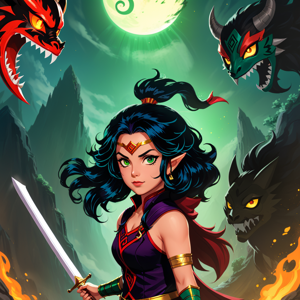 a girl in a blue shirt and red bow tie standing in front of a forest