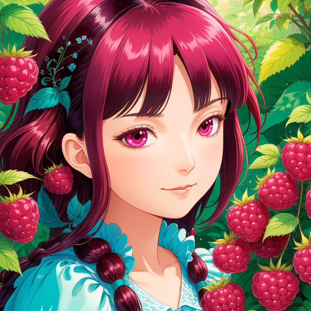 a girl with red hair and pink eyes standing in front of a bush of ras