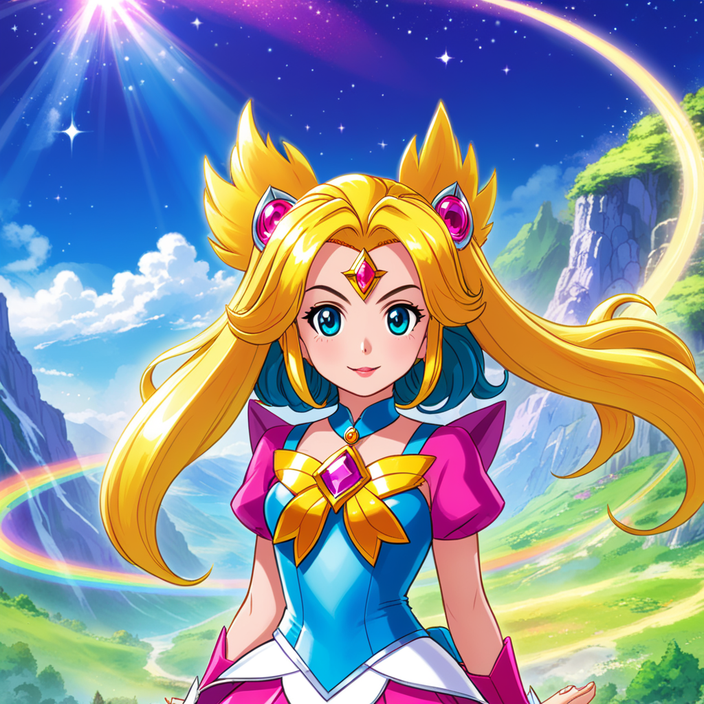 a cartoon girl with long blonde hair standing in front of a mountain