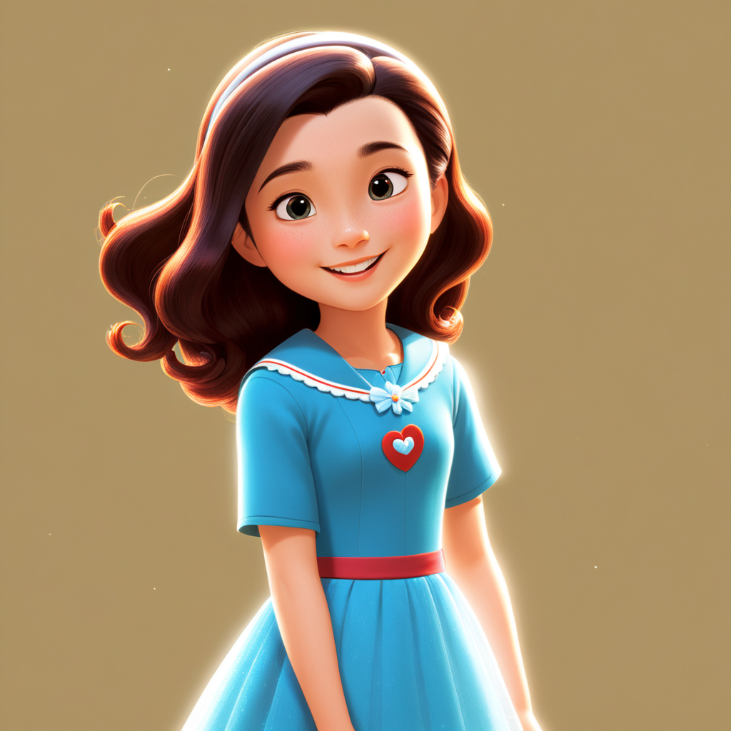 a girl in a blue shirt and red bow tie standing in front of a forest