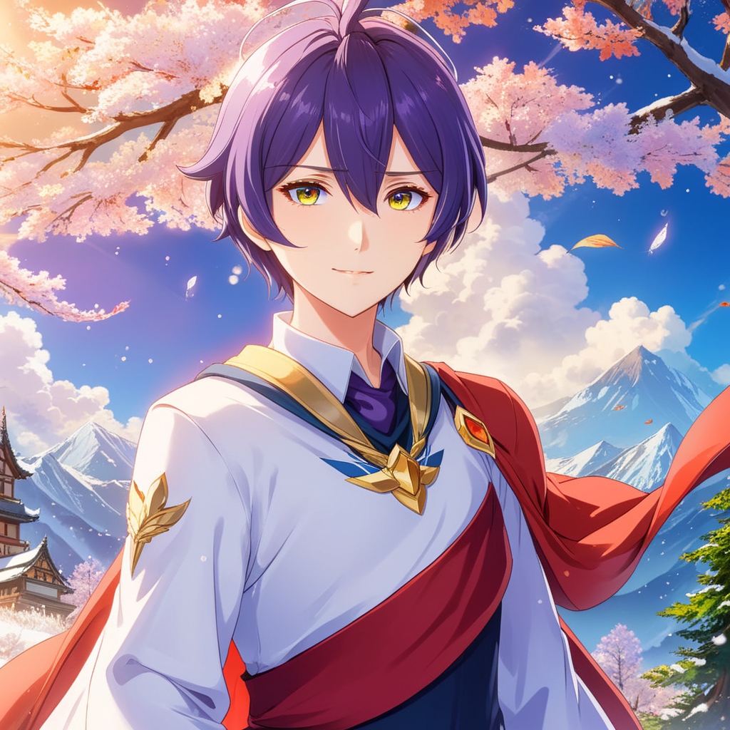 a woman in a blue and red outfit standing in front of a cherry blossom tree