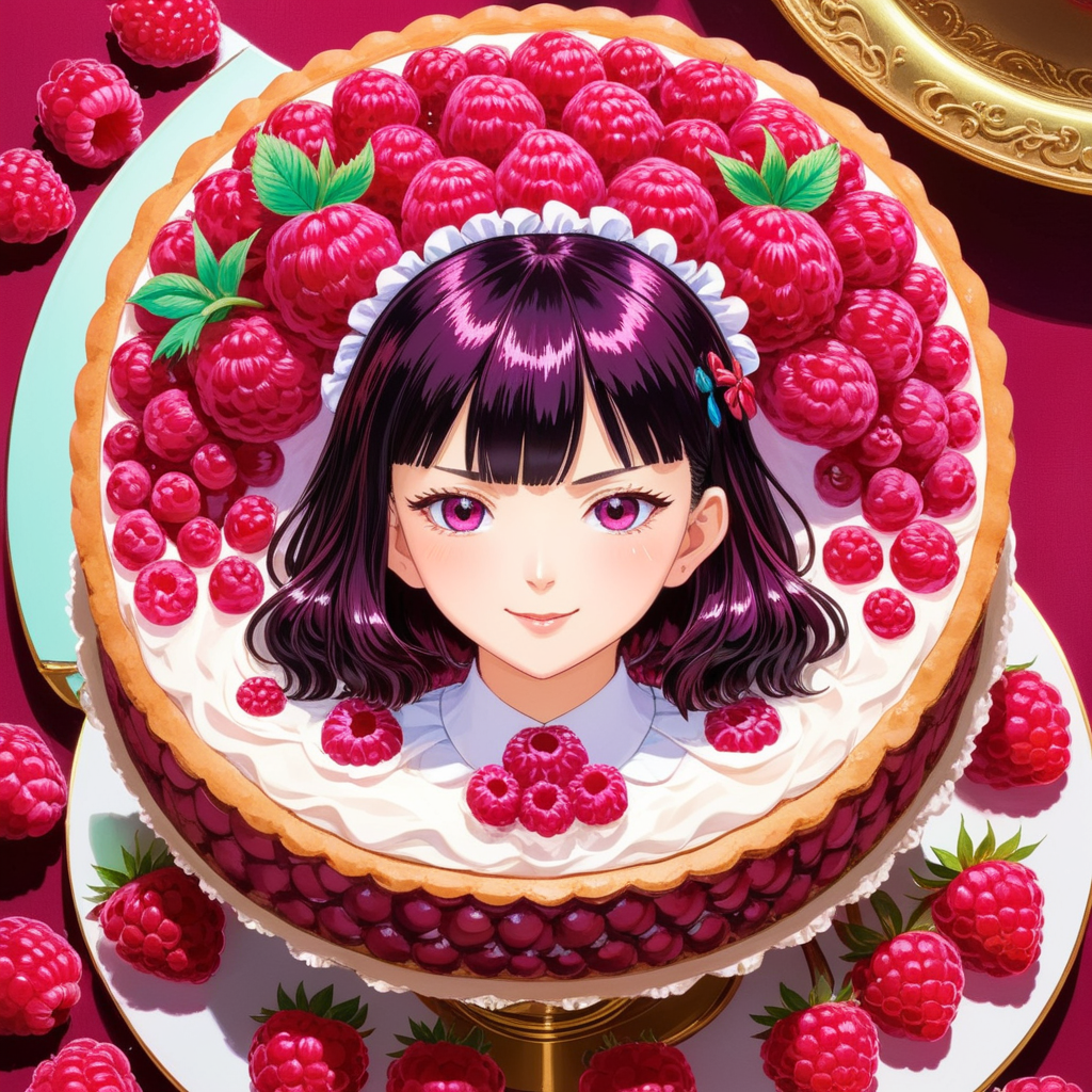 a cake with a picture of a girl surrounded by raspberries