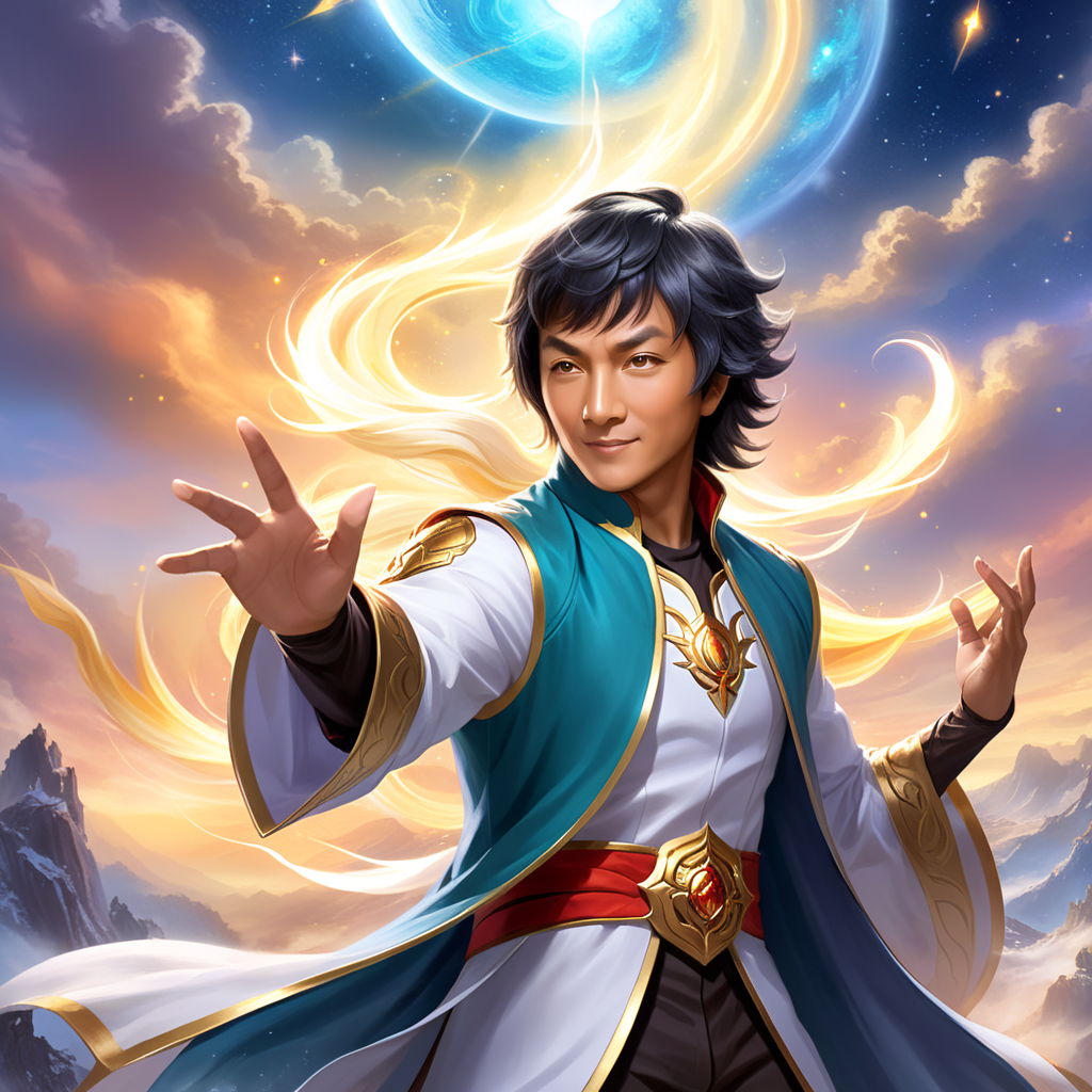 a painting of a man in a blue and white outfit