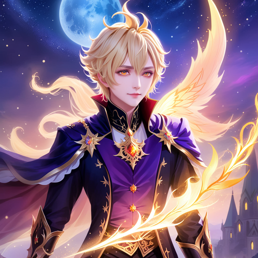 a man with blonde hair wearing a purple outfit and holding a sword
