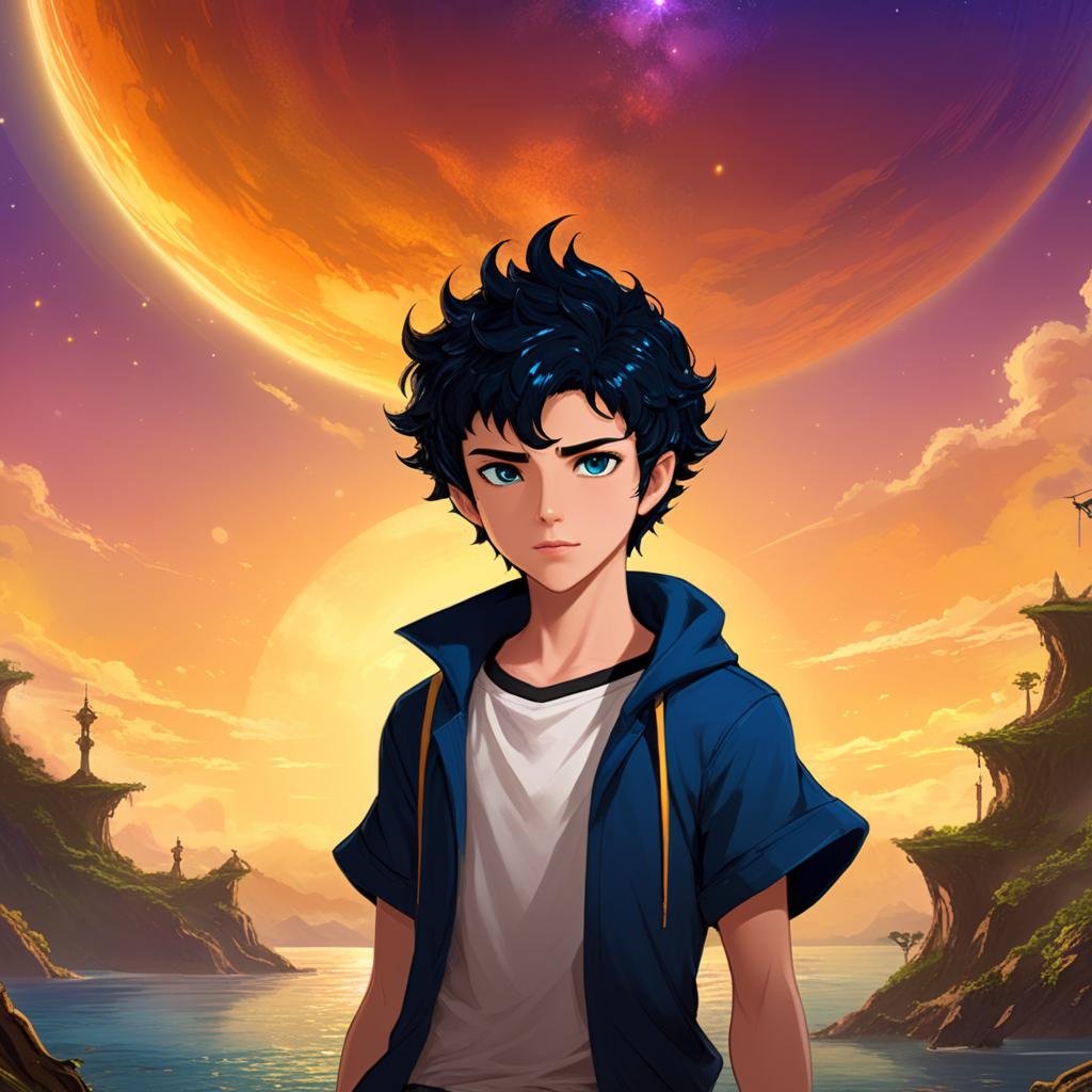 a boy standing in front of a waterfall with a castle in the background