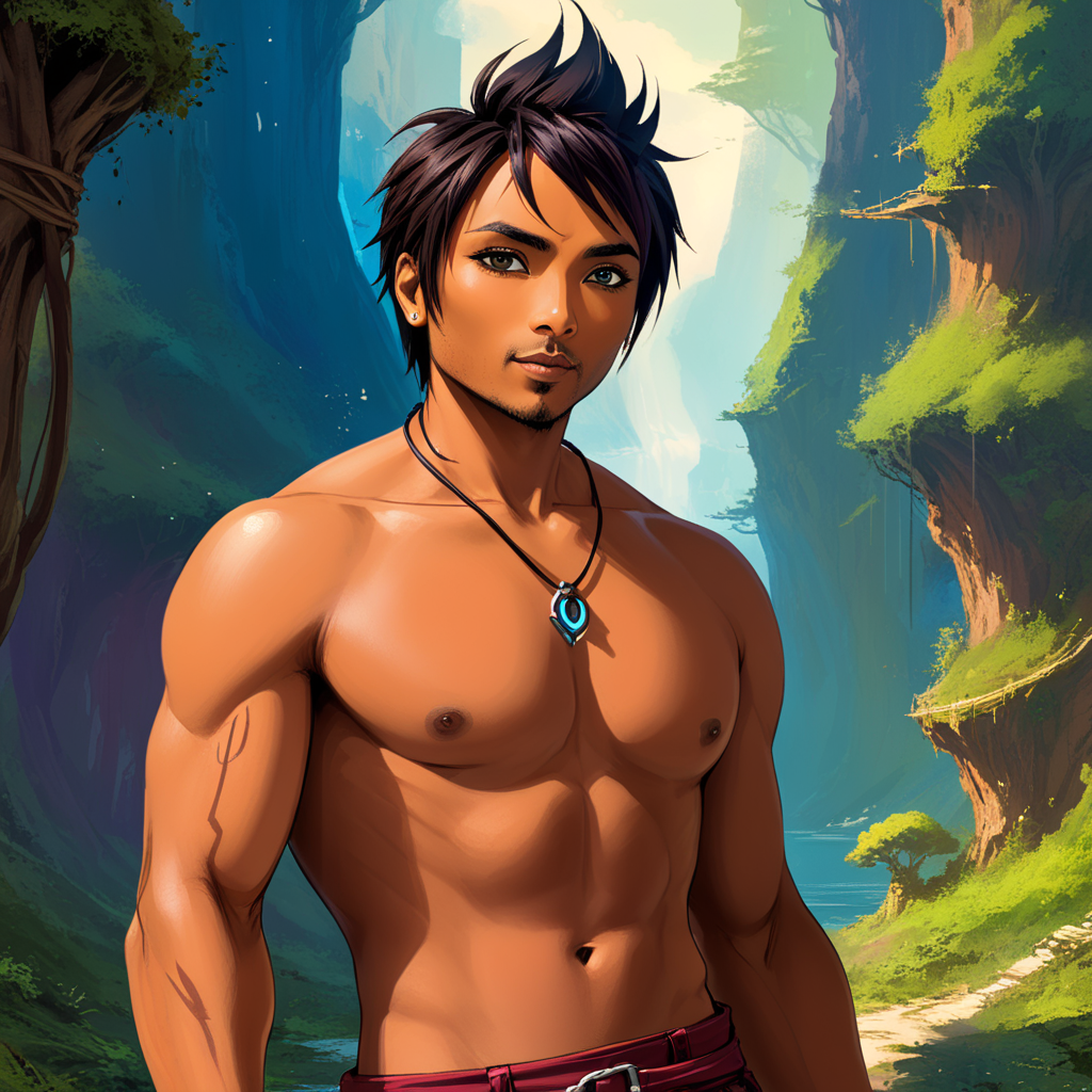 a man with a necklace standing in a forest