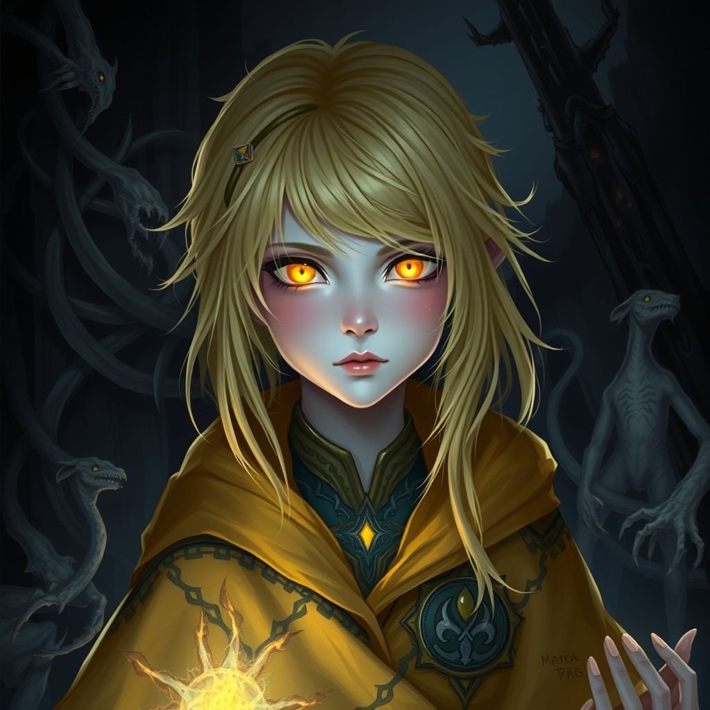 Blond hair anime young idol with yellow eyes and as yellow mage