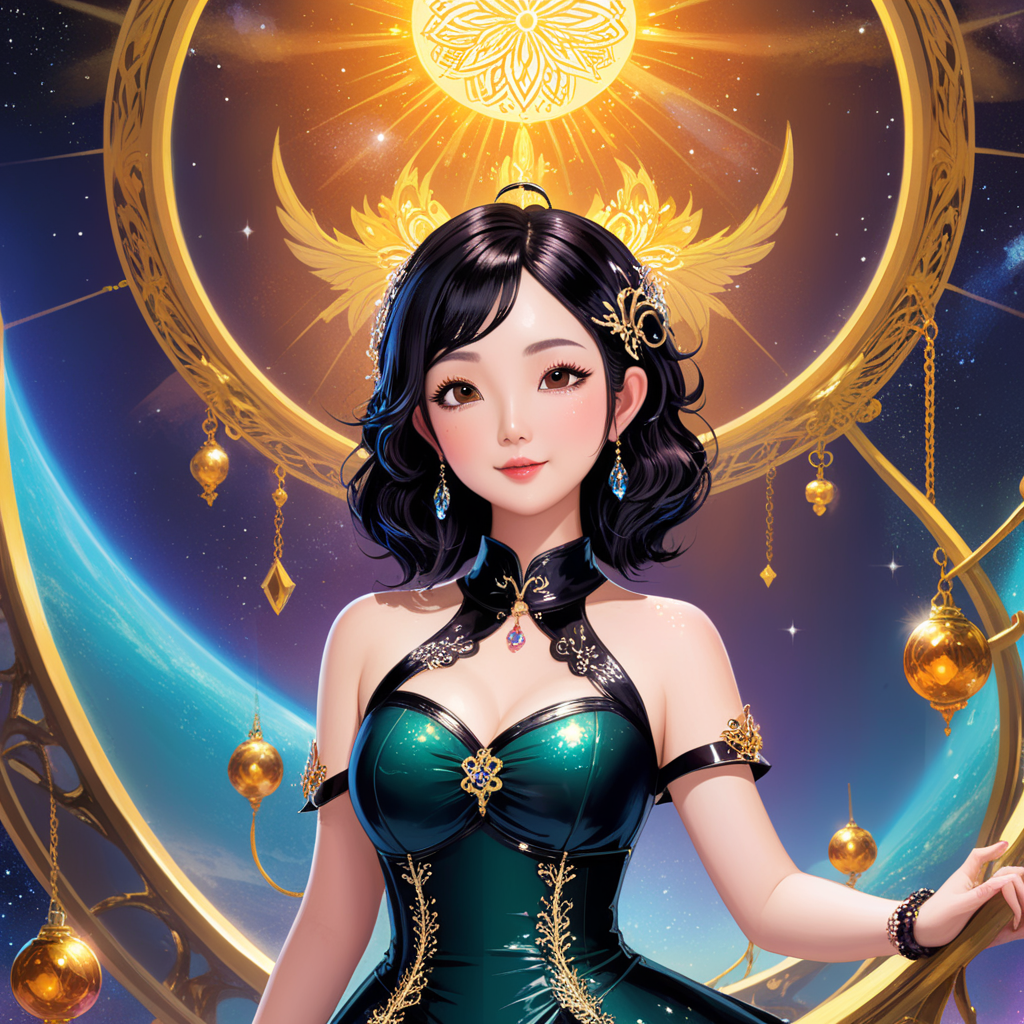 a woman in a green dress standing in front of a golden sun