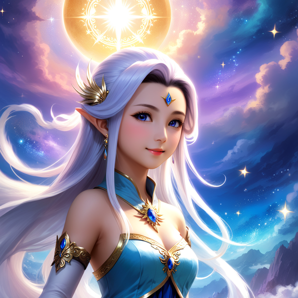 a woman with white hair and blue eyes wearing a blue dress