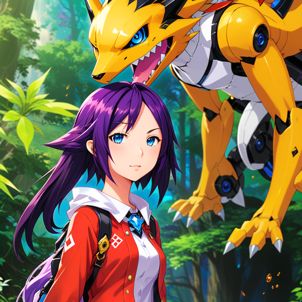 Kawaii chibi style of a teenager girl with dark brown hair and brown eyes with a chocolate lab that is a service dog