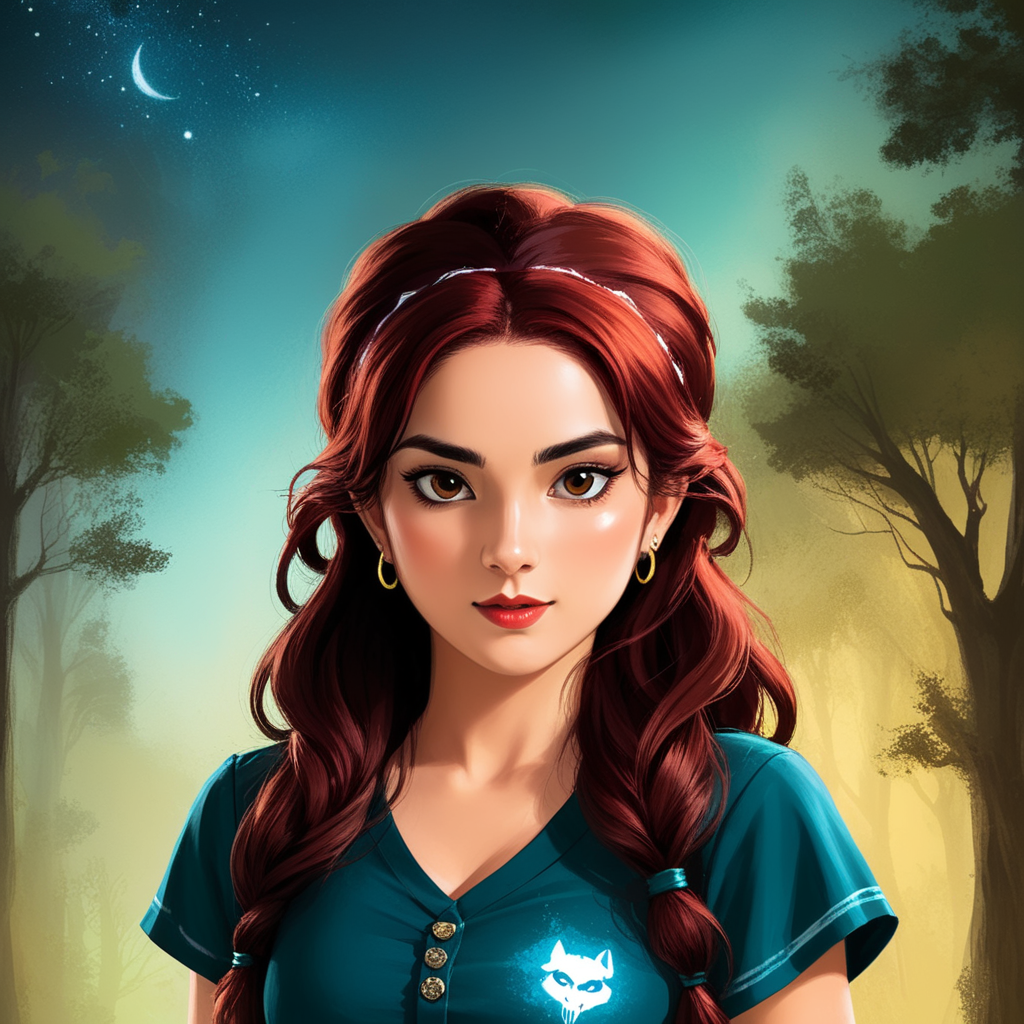 a girl with long red hair standing in a forest