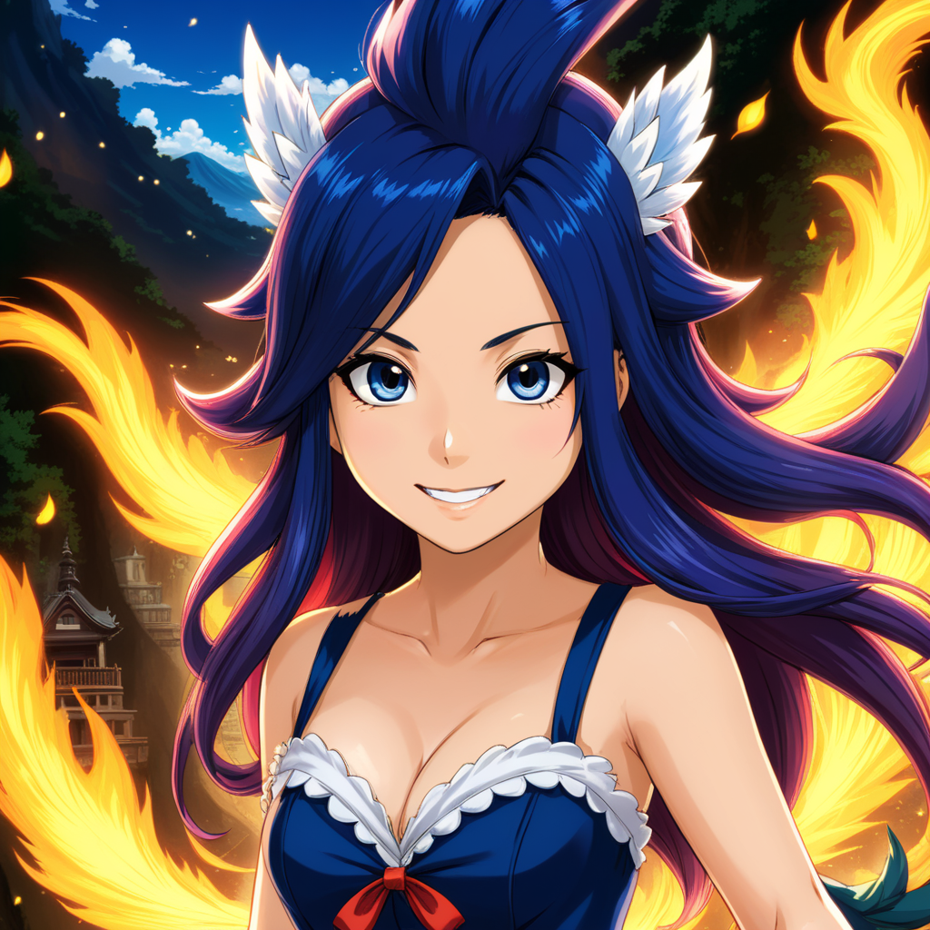 a girl in a blue shirt and red bow tie standing in front of a forest