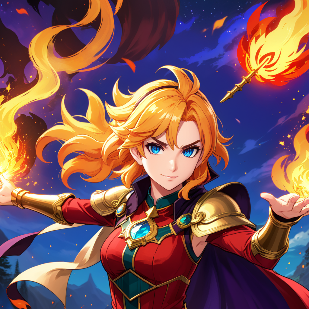 a woman in a red and gold outfit holding a flame
