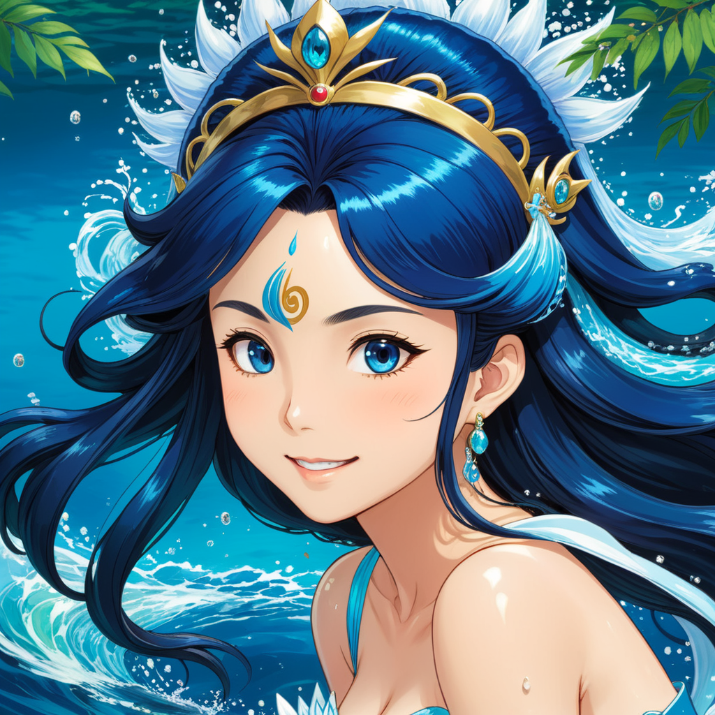 a woman with blue hair and a crown on her head