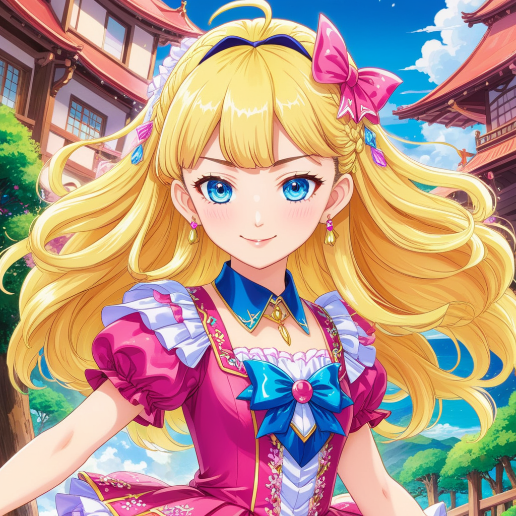 a girl with red hair and blue eyes standing in front of a castle
