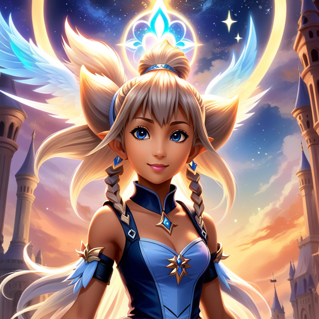 Kawaii chibi style of a girl with brown hair and brown eyes with a chocolate lab that is a service dog
